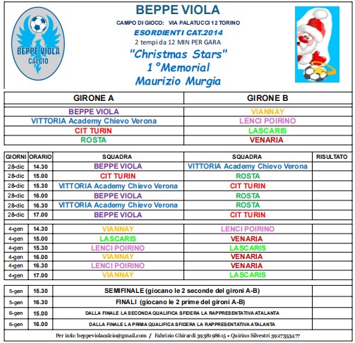 In un clima di euforia, di festa, di famiglia e di casa (così come la filosofia e la storia del Beppe Viola impone e conquista chiunque entri nell’impianto di casa del club della famiglia Arcella) c’è già grande fermento ed emozione nel vedere sul tavolo dei sogni, tutte le coppe e i premi che verranno assegnati al termine della manifestazione che vedrà in campo - in tutte le festività natalizie - squadre del panorama calcistico torinese, piemontese e quella voglia di stupire nel gran finale con un epilogo dove in campo ci saranno anche le squadre professionistiche! Nomi e squadre partecipanti che saranno rese note al più presto ma che i grandi cuori del Beppe Viola stanno cullando nel loro cuore e nei loro pensieri.