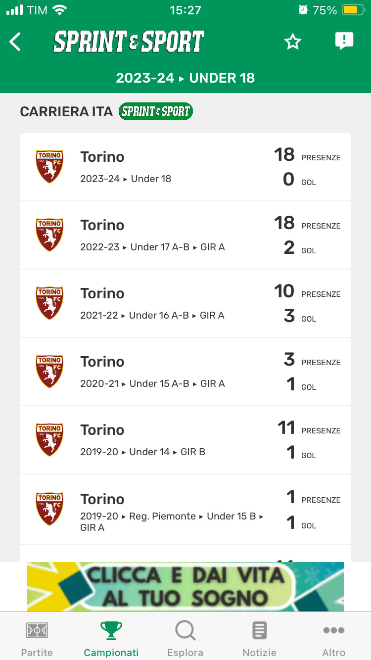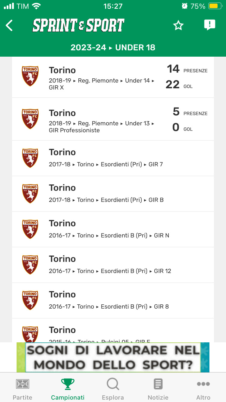 LA CARRIERA DI LUCA SCARFIELLO CON LA MAGLIA DEL TORINO DALL'APP DI SPRINT E SPORT