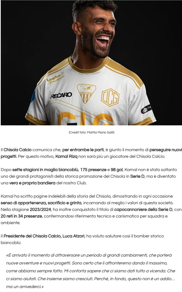 Ora è tutto vero e ufficiale: le strade del Chisola Calcio e di Kamal Rizq si separano. Con una nota carica di riconoscenza, il club biancoblù ha comunicato che “per entrambe le parti è giunto il momento di perseguire nuovi progetti” e che l’attaccante non sarà più un giocatore del Chisola.