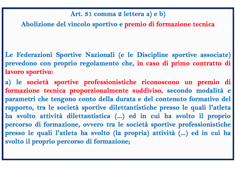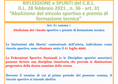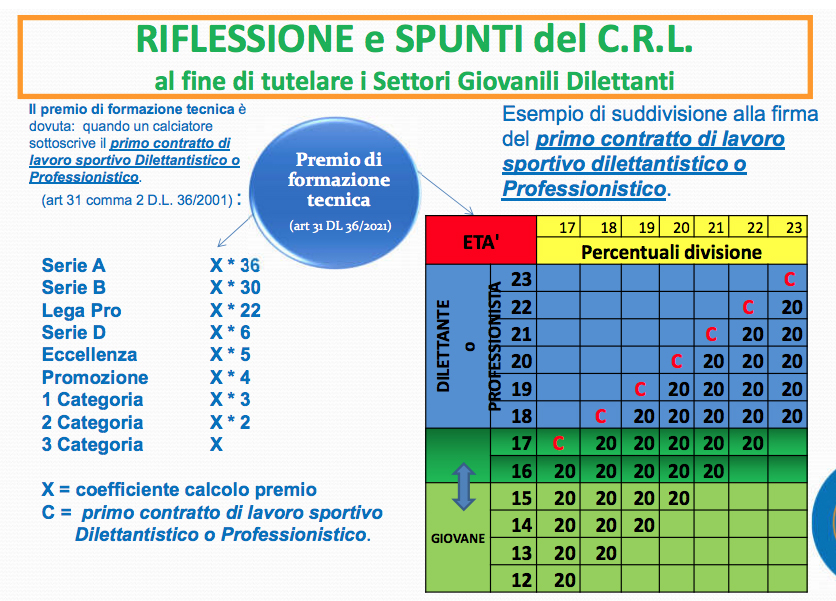 Altro tema fondamentale nella Legge di Riforma dello Sport, l’articolo 31 ai commi a) e b), nei quali viene stabilito che, in caso di stiupula di primo contratto di lavoro sportivo di un calciatore è fondamentale che le società che tesserano questi giocatori, riconoscano un premio alle società di base che lo hanno formato. Con l’abolizione del vincolo, viene cancellato anche il meccanismo del premio di preparazione. Proprio per questo, è necessario formulare una normativa che ‘sostituisca’ il premio di preparazione con un premio di formazione tecnica i cui meccanismi, valori e tabelle dovranno essere individuati. A fianco la proposta del CRL che prevede, per chi tessera un calciatore con contratto di lavoratore sportivo, indennizzi sulla base della categoria del club di destinazione, richiamando anche il regolamento Fifa sui trasferimenti dei calciatori, che stabilisce che ‘la formazione di un calciatore ha luogo tra i 12 e i 23 anni’. Senza vincolo e senza premio sarà la morte delle società che non avranno garanzie e tutele nella formazione.