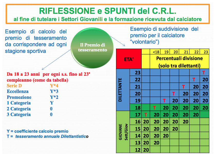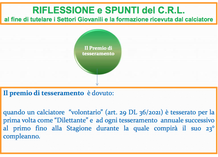 Nel momento in cui un ‘calciatore volontario’ passa dal settore giovanile a una prima squadra, diventando ‘Dilettante’, fondamentale prevedere un premio di tesseramento alle società che lo hanno formato nei 5 anni precedenti.