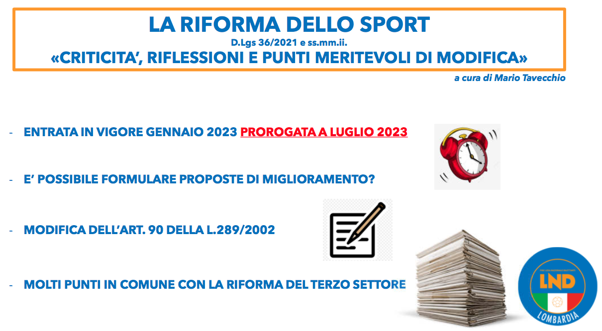 Nell’assemblea Ordinaria Biennale del Comitato Regionale Lombardia del 13 gennaio 2023, un momento di grande confronto e proposta, di dibattito e ferma convinzione che non ci sia più tempo per rinviare e non affrontare le tematiche più ‘urgenti e pericolose’ che la nuova Legge di Riforma dello Sport rischia di minare alla base il movimento del calcio giovanile e dilettantistico. Un’assemblea nella quale il Comitato Regionale Lombardia, ha presentato e illustrato tutta una serie di proposte e analisi, sulle possibili e necessarie risposte e modifiche da apportare all’imminente entrata in vigore della Legge 36-2021 e la Riforma dello Sport.