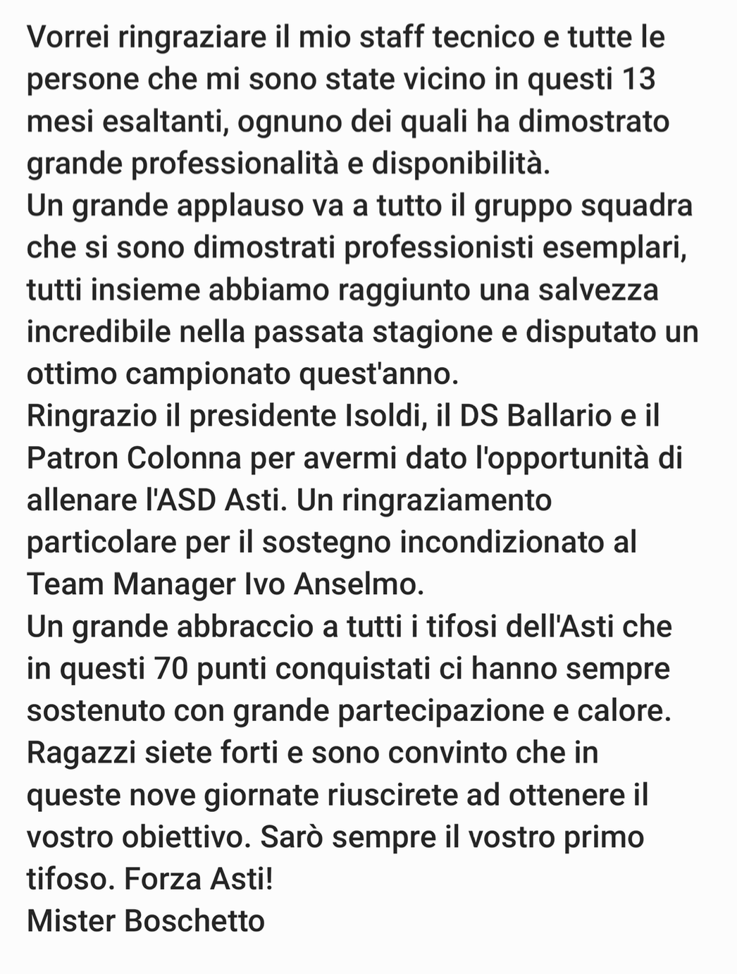 Riccardo Boschetto preferisce non rilasciare dichiarazioni, interviste o altro, in un momento non semplice e delicato, e ha affidato ad una lettera il suo pensiero, il suo ringraziamento e il suo saluto all'Asti.