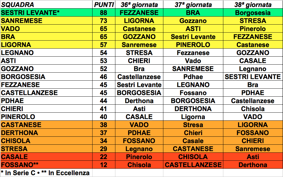 Castanese 38 punti: trasferta a Vado, in casa con lo Stresa e trasferta a Ligorna. Coi 3 punti d’obbligo con lo Stresa si sale a 41 punti, ne serve almeno 1 tra Vado e Ligorna o forse 2…