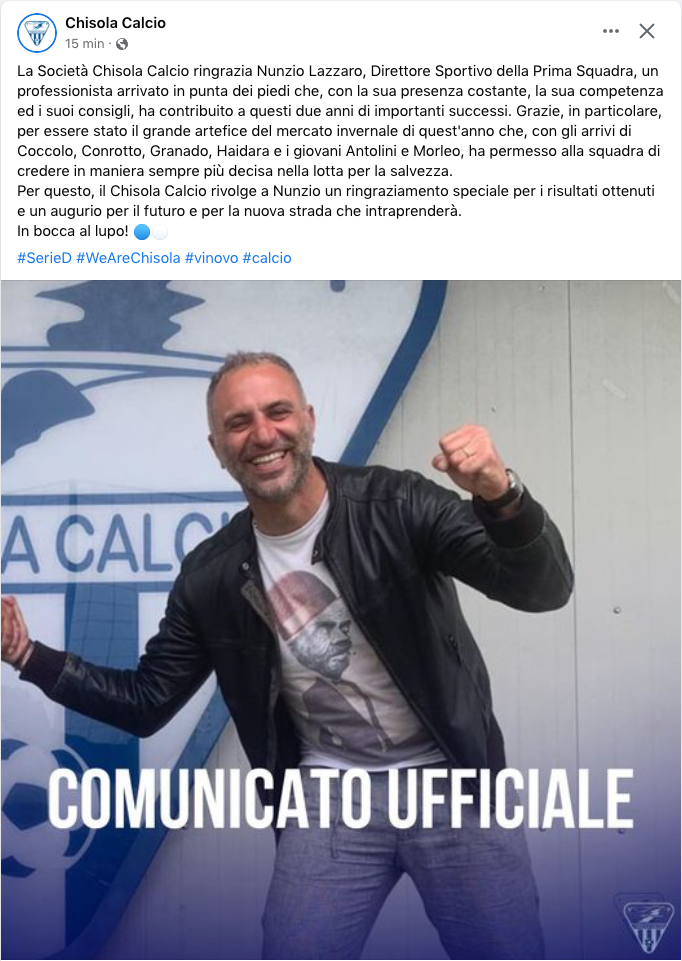 Quest’anno poi un miracolo sportivo e una soddisfazione immensa vissuta insieme alla società che ha fatto di tutto per raggiungerla e grazie al quale ho conosciuto e lavorato con una grande persone e un grande allenatore come Fabio Nisticò, con cui abbiamo costruito un rapporto davvero speciale, simboleggiato in quel lungo abbraccio dopo l’incredibile salvezza raggiunta. Come detto e ribadisco, sono e dobbiamo essere tutti fieri e orgogliosi di quello che abbiamo fatto. Da oggi non sono più il Ds del Chisola, con l’augurio che qualcuno magari possa pensare a me, così, dopo qualche giorno di riposo e riflessione, spero di poter iniziare e proseguire in altre società questo ruolo che mi affascina. Come detto però, ringrazio Atzori e tutto il Chisola, col presidente resto e resterò sempre in amicizia e tornerò sempre con piacere e col sorriso al Chisola».