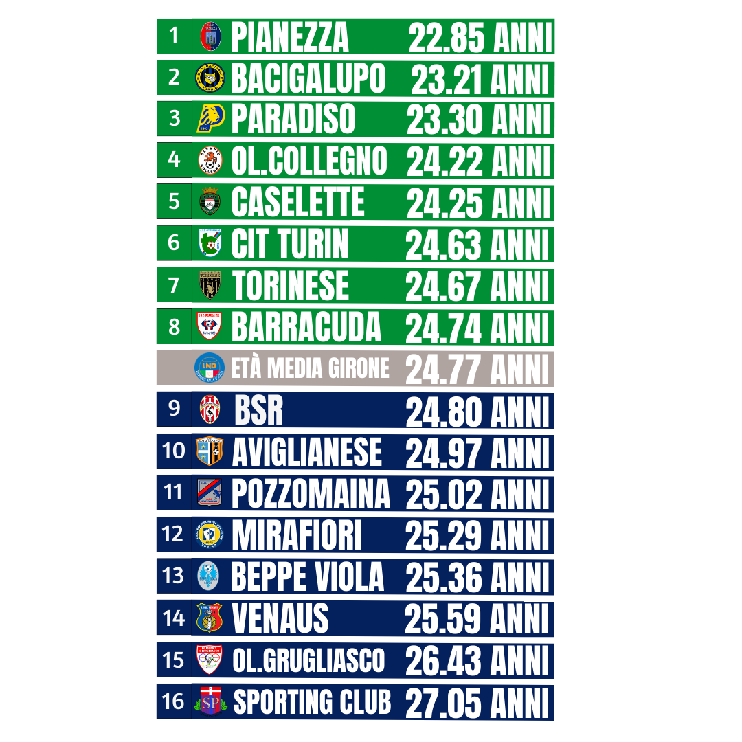Le squadre più anziane delgirone invece raccontano quanto sia fondamentale avere un settore giovanile da dove attingere per giocatori con meno primavere sulla carta di identità. A guidare la classifica dei più anziani della categoria è lo Sporting Club, la società neopromossa e rifondata pochi anni fa che sta incantando tutti per le sue prestazioni in campo e che vanta una media di poco superiore ai 27 anni. Giocatori di grande esperienza, molti dei quali appartengono alla squadra fin da quando militava in Terza Categoria, che per ben 15 volte hanno reso i rossoblù la squadra meno giovane del girone. Segue l’Olimpica Grugliasco con una media di 26,43 anni: l’assenza di ogni reparto del settore giovanile rende difficile diminuire l’età generale e la società si affida a giocatori già presenti negli anni passati o ad esuberi in arrivo dalle concorrenti. Chiude il podio il Venaus, squadra in grado di alternare giovani di prospettiva ad esperti della categoria come l’eterno bomber Alessandro Bailo o il centrocampista Luca Caffo, rispecchiandosi in una media più contenuta di 25,59 anni di età.