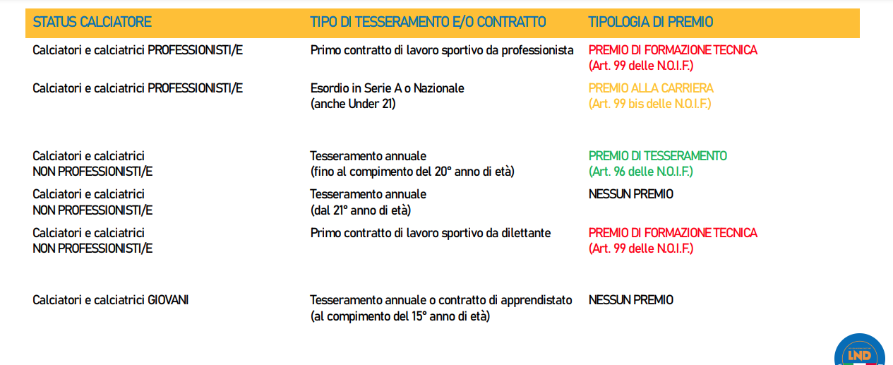 Facciamo un esempio. Un calciatore con vincolo in scadenza nel 2025 o 2026 presso la SOCIETÀ A si trasferisce nella stagione 2023/24 presso la SOCIETÀ B. La società B ha pagato il premio di preparazione alla società A e sottoscrive con il calciatore un contratto sportivo con scadenza al 30 giugno 2024. Una SOCIETÀ C che vuole tesserare il calciatore per la stagione 2024/25 È LIBERA DI FARLO corrispondendo - in base al tipo di tesseramento e dall'età del giocatore - il premio di tesseramento, il premio di formazione tecnica o nulla (clicca per consultare lo schema riassuntivo e le tabelle).