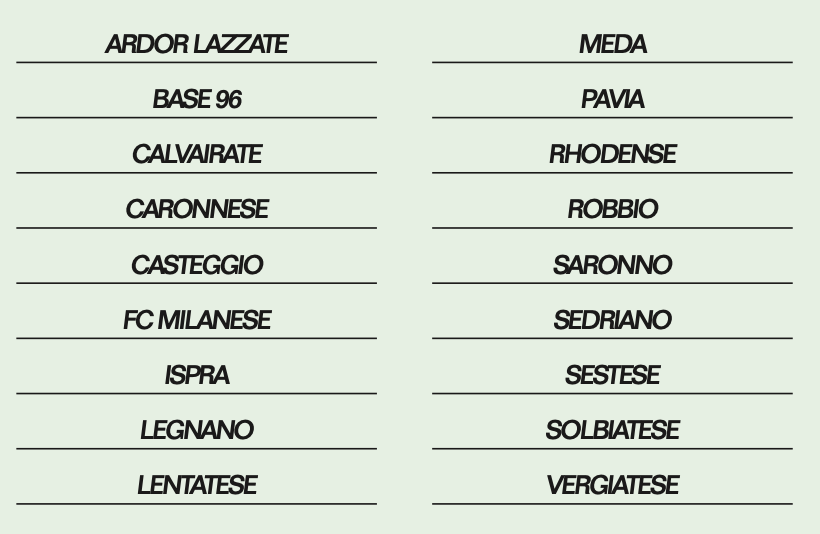 Mariano sì, Mariano no? In questo universo la seconda, per non renderla l'unica comasca fuori dal più probabile Girone B, anche perché gli arrivi da Milano di Rhodense e Sedriano e l'ultimo vertice di un triangolo di fuoco in Brianza (Base-Meda-Lentatese) potrebbero bastare per riempire un campionato dalla matrice varesotta un po' più debole del solito. Perse Verbano, Accademia Pavese e Castanese, sono arrivate solo la lontanissima Ispra e l'incerto Legnano, complice il ripescaggio dalla Promozione di un Robbio che allarga il compasso sulla mappa. Nel mezzo le certezze Caronnese, Saronno, Sestese, Solbiatese e Vergiatese, accompagnate dalle meridionali Casteggio e Pavia e dai soliti nomi provenienti dal cuore della regione, ovvero Ardor Lazzate, Calvairate e FC Milanese.