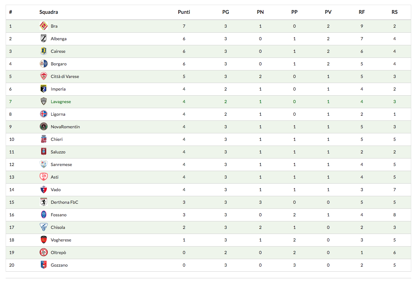 Classifica: Bra 7, Albenga 6, Cairese 6, Borgaro 6, Città di Varese 5, Imperia* 4, Lavagnese* 4, Ligorna* 4, NovaRomentin 4, Chieri 4, Saluzzo 4, Sanremese 4, Asti 4, Vado 4, Derthona FbC 3, Fossano 3, Chisola 2, Vogherese 1, Oltrepò* 0, Gozzano 0.