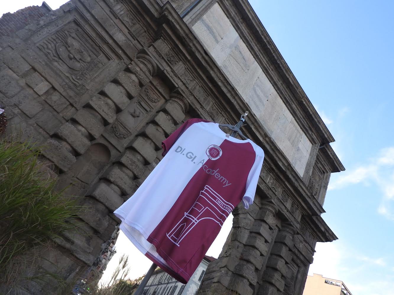 La maglia della Virtus Romana Calcio appesa simbolicamente all'arco di Porta Romana
