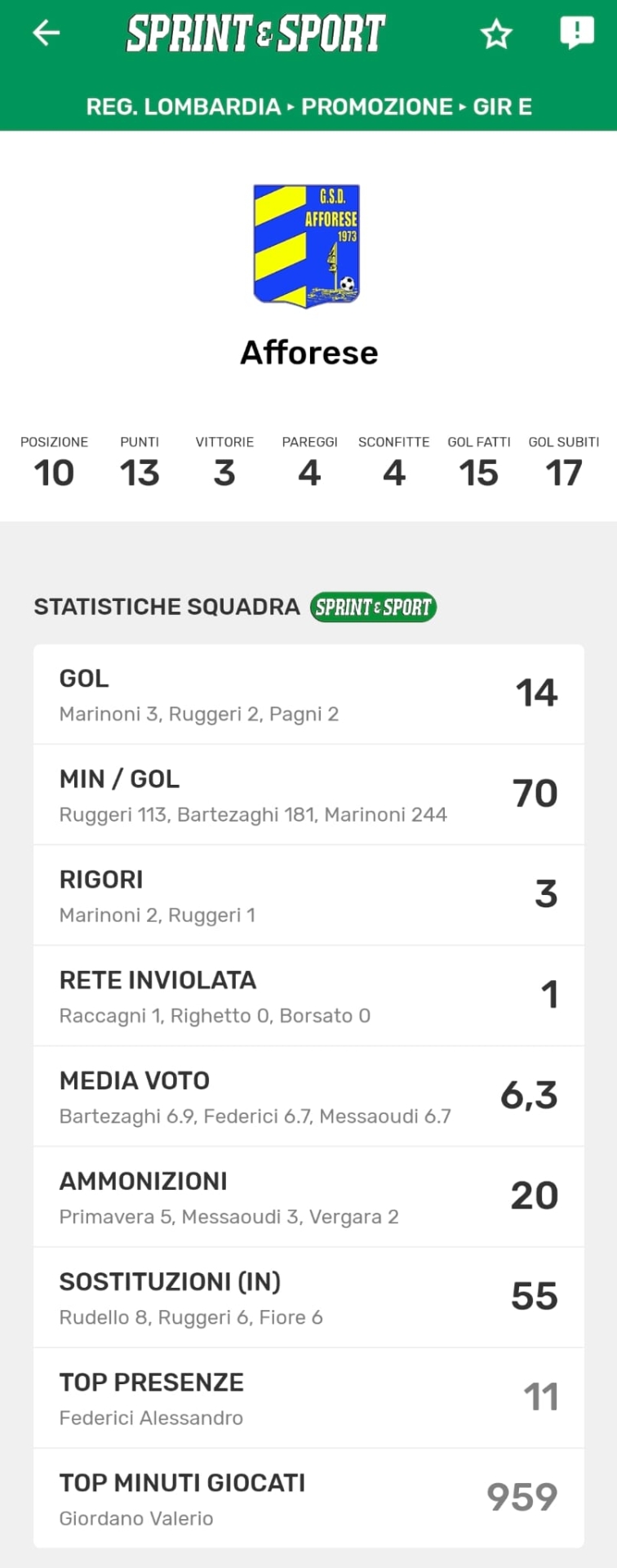 Le statistiche di squadra dell'Afforese, disponibili solo sull'app di Sprint e Sport: clicca l'immagine, scarica l'app e abbonati per scoprirle tutte!