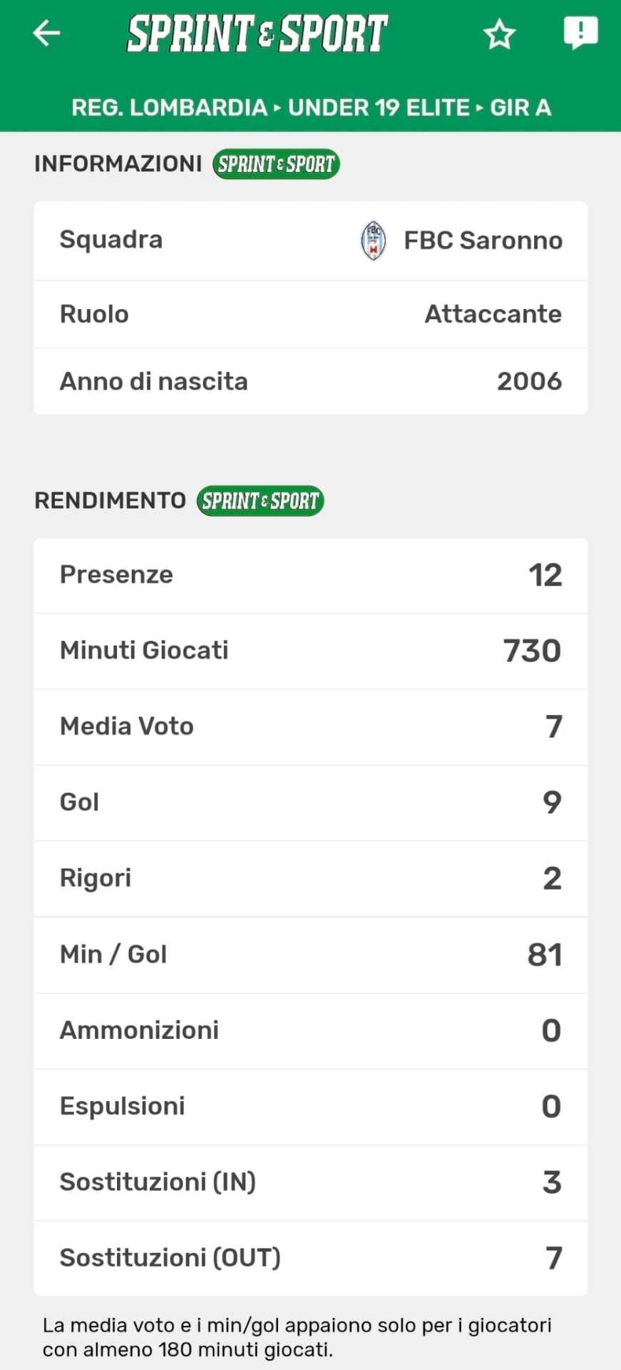Uno dei protagonisti indiscussi dello scorso weekend, nonché uno dei trascinatori del Saronno. Per provare a sognare il secondo posto e i quarti di finale con direzione titolo regionale, infatti, gli Amaretti possono contare su un classe 2006 da 9 gol in 12 partite, tre dei quali segnati nella trasferta di Gorla Minore: una tripletta da MVP.
