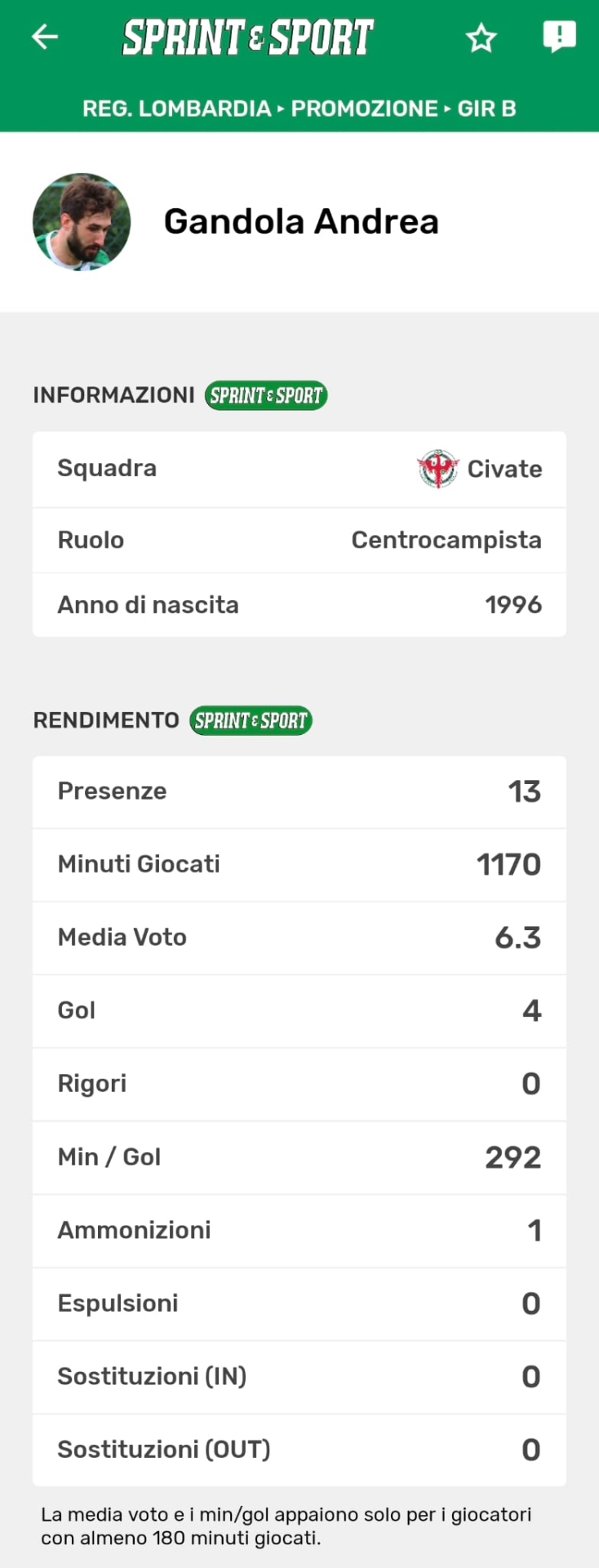 Le statistiche complete di Gandola, disponibili solo sull'app di Sprint e Sport: clicca l'immagine, scarica l'app e abbonati per scoprirle tutte!