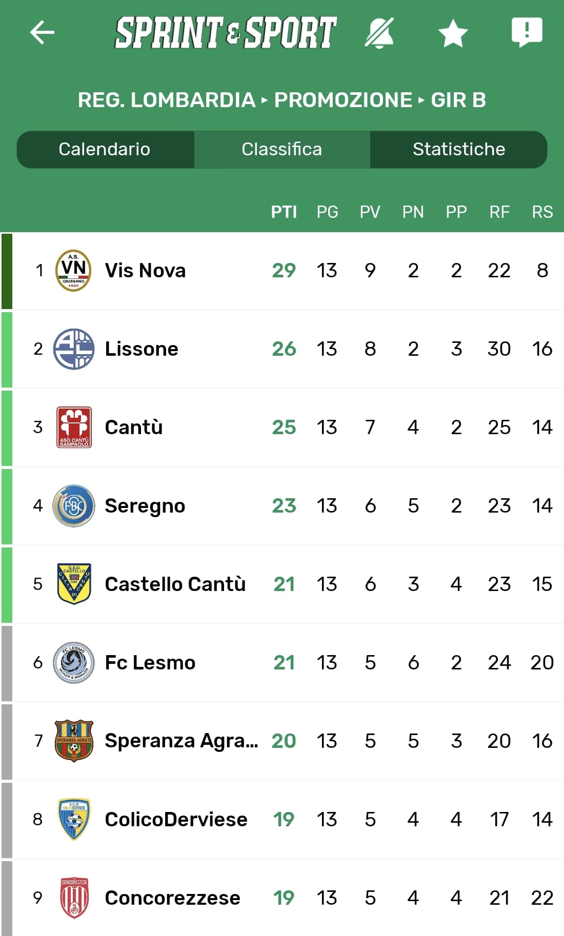 La parte sinistra della classifica del Girone B di Promozione
