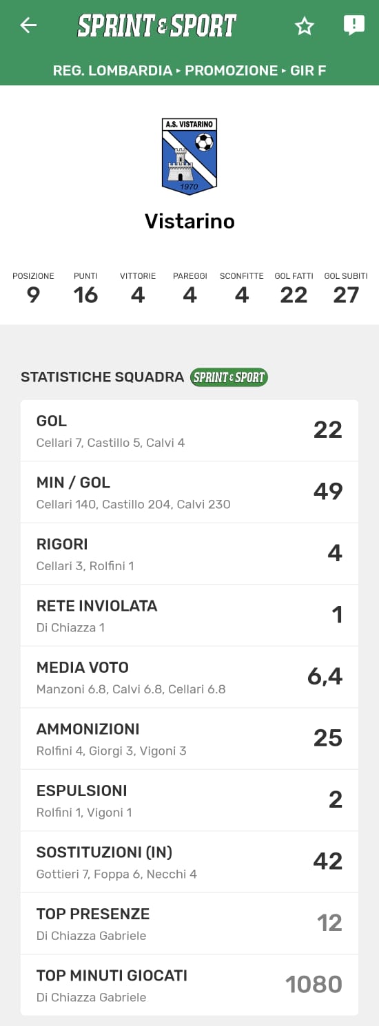 La scheda di squadra del Vistarino, visibile solo sull'app di Sprint: clicca sull'immagine per scaricarla!