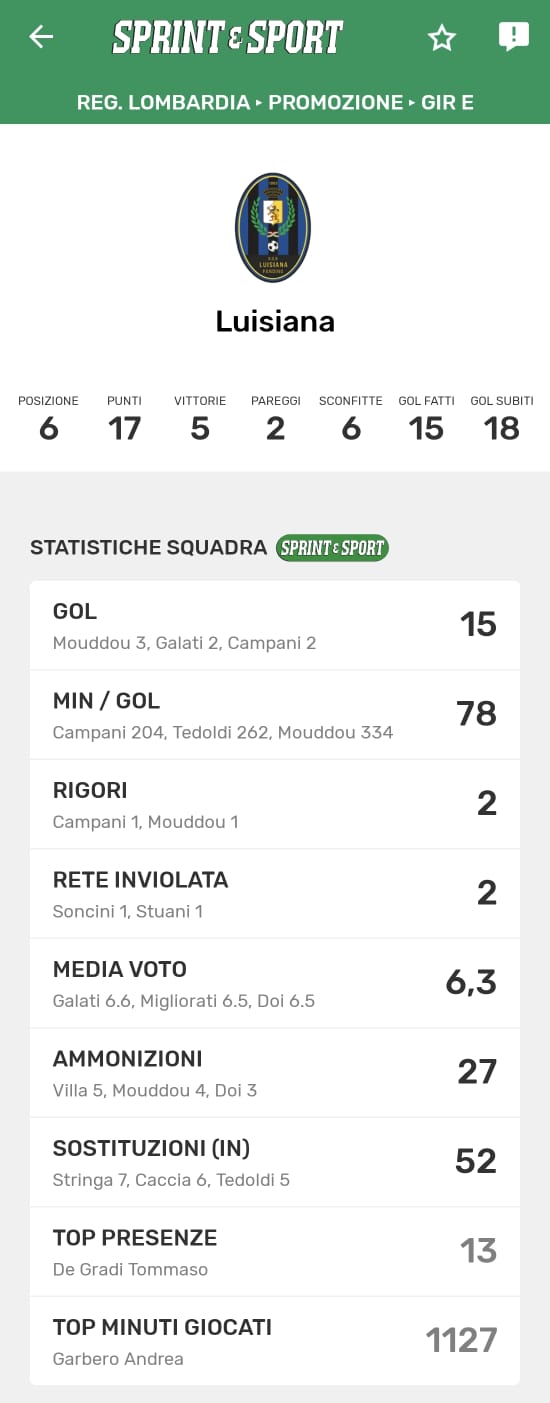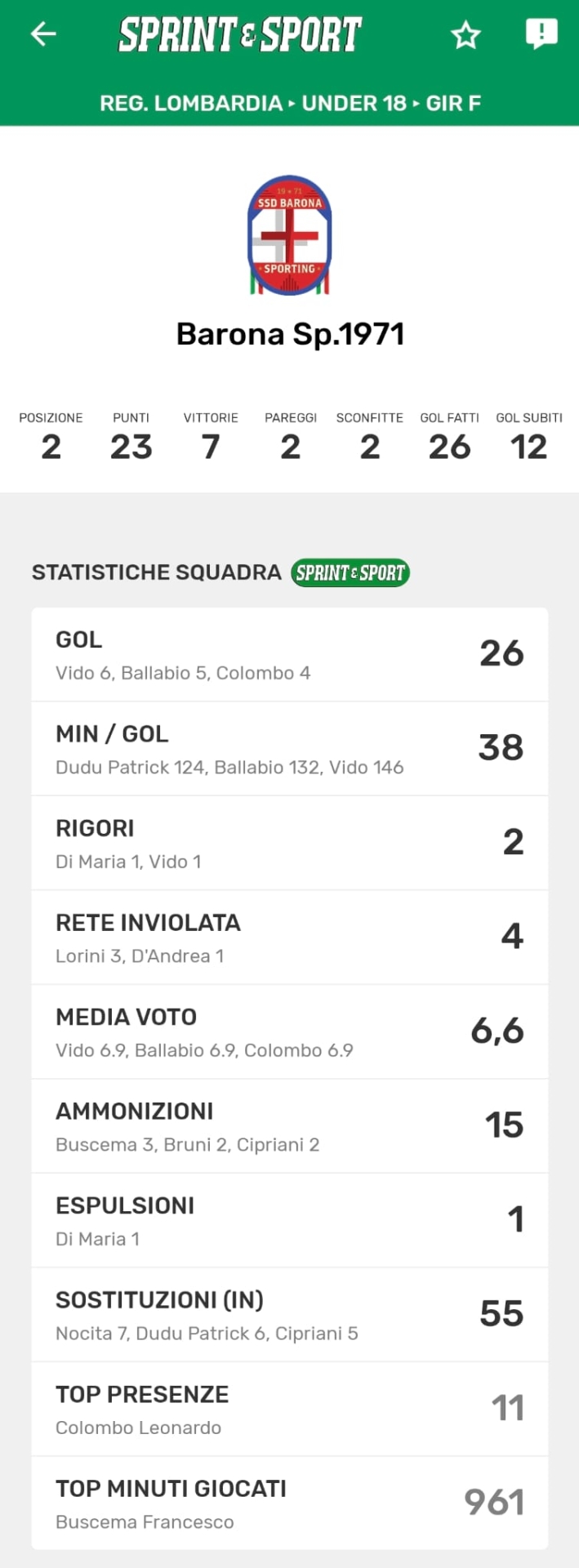 Le statistiche complete della Barona, disponibili solo sull'app di Sprint e Sport: clicca l'immagine per scaricarla!