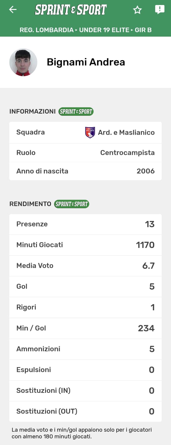 Le statistiche complete di Bignami, disponibili solo sull'app di Sprint e Sport: clicca l'immagine per scaricarla!