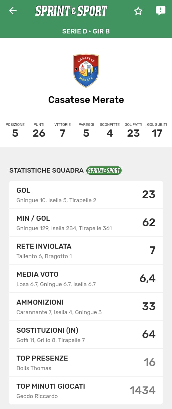 Le statistiche complete della Casatese Merate, disponibili solo sull'app di Sprint e Sport: clicca l'immagine per scaricarla!