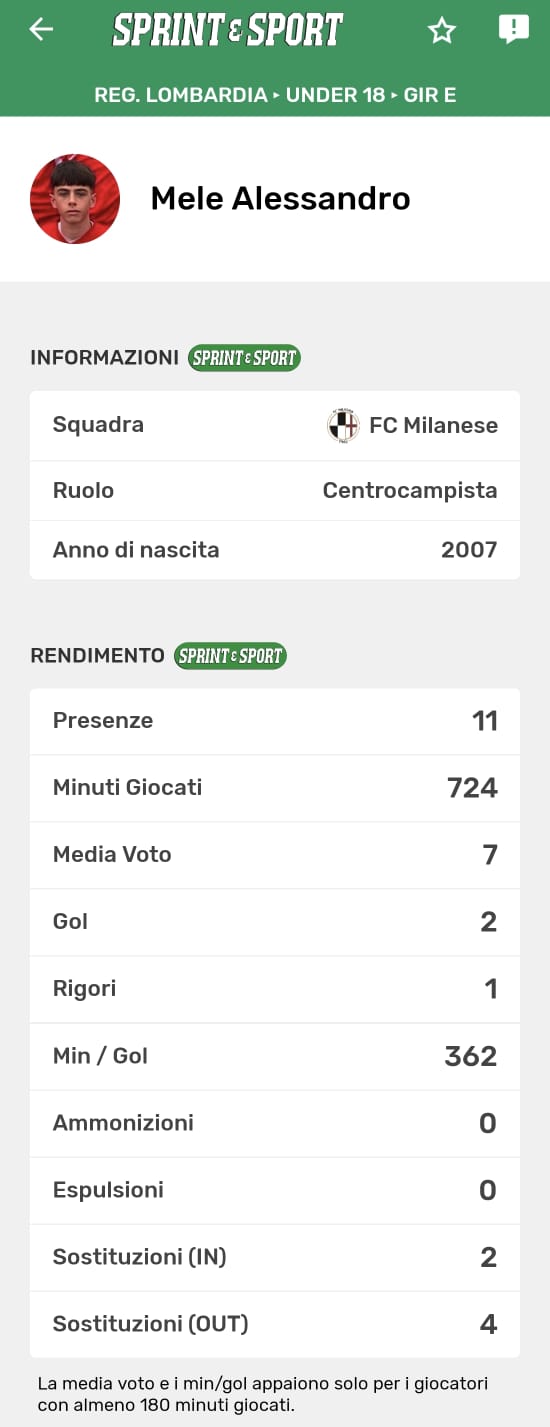 Le statistiche complete di Mele, disponibili solo sull'app di Sprint e Sport: clicca l'immagine per scaricarla!