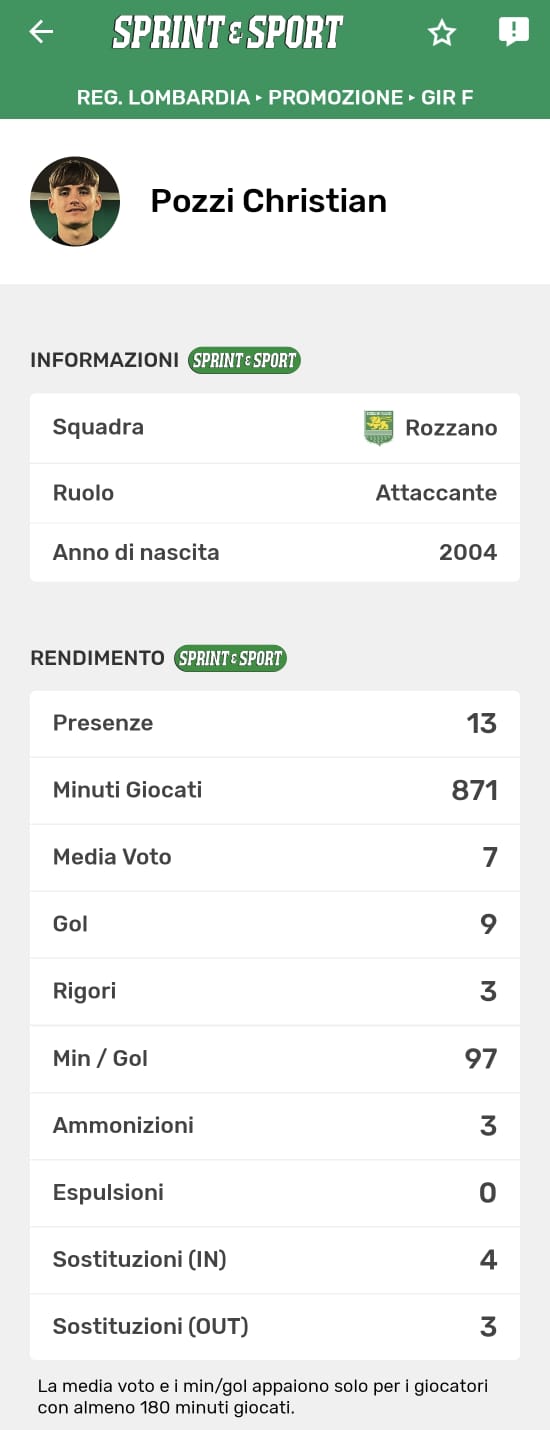 Le statistiche complete di Pozzi, disponibili solo sull'app di Sprint e Sport: clicca l'immagine per scaricarla!