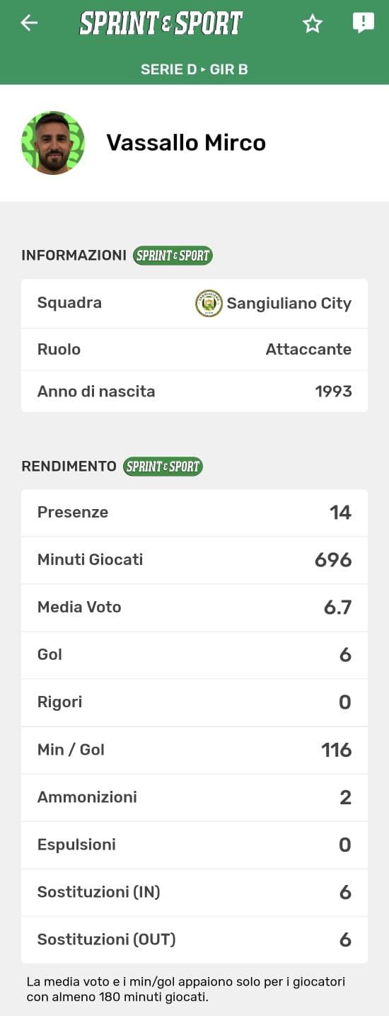 Le statistiche complete di Vassallo, disponibili solo sull'app di Sprint e Sport: clicca l'immagine per scaricarla!