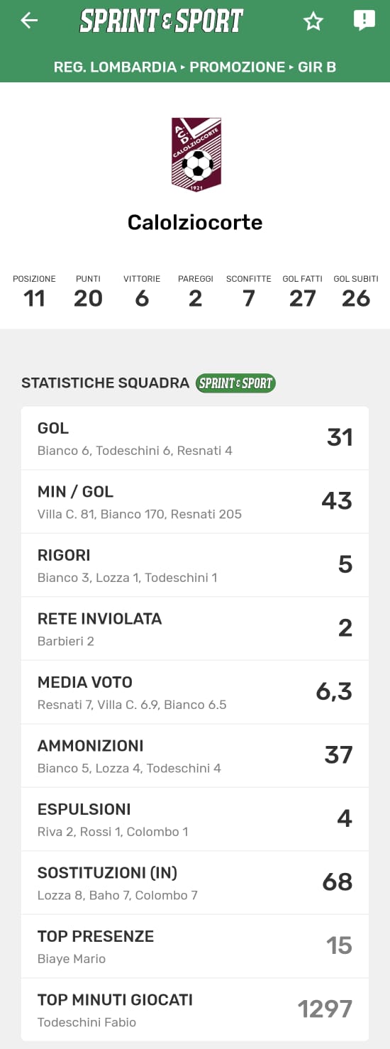 Le statistiche complete di squadra del Calolziocorte, disponibili solo sull'app di Sprint e Sport: clicca l'immagine per scaricarla!