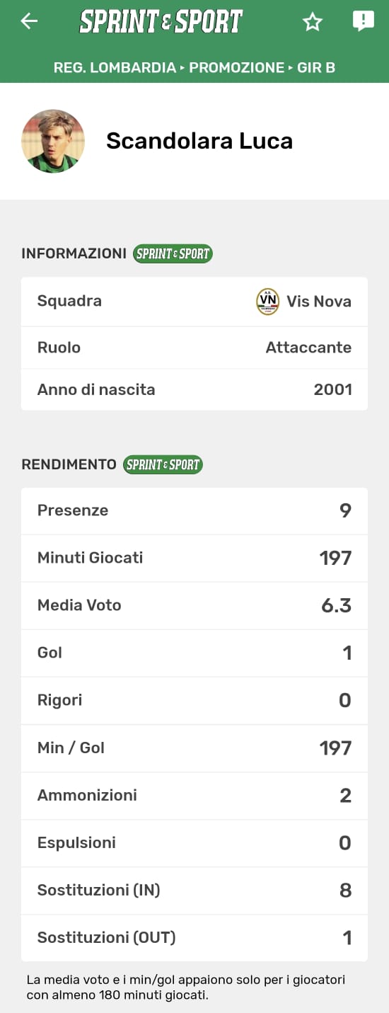 Le statistiche complete di Scandolara, disponibili solo sull'app di Sprint e Sport: clicca l'immagine per scaricarla!