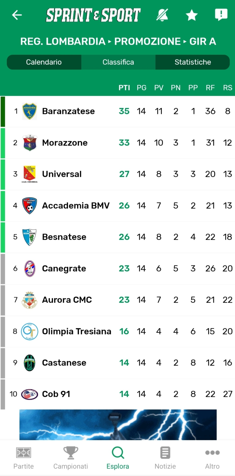 La parte alta della classifica del girone A di Promozione. Clicca qui per scaricare la nostra app e consultare la classifica completa