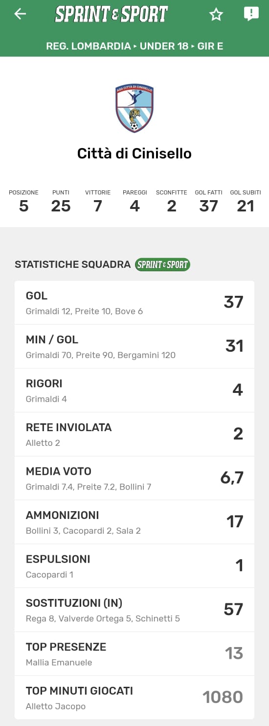 Le statistiche di squadra del Città di Cinisello, disponibili solo sull'app di Sprint e Sport: clicca l'immagine per scaricarla!
