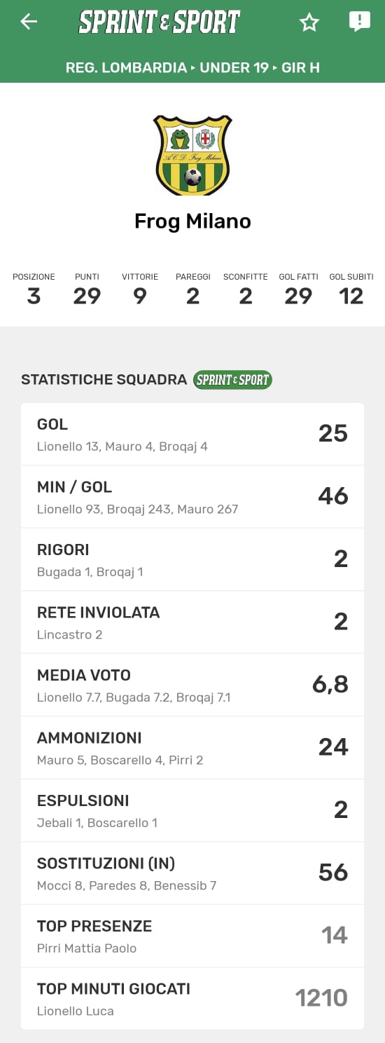 Le statistiche di squadra della Frog Milano, disponibili solo sull'app di Sprint e Sport: clicca l'immagine per scaricarla!