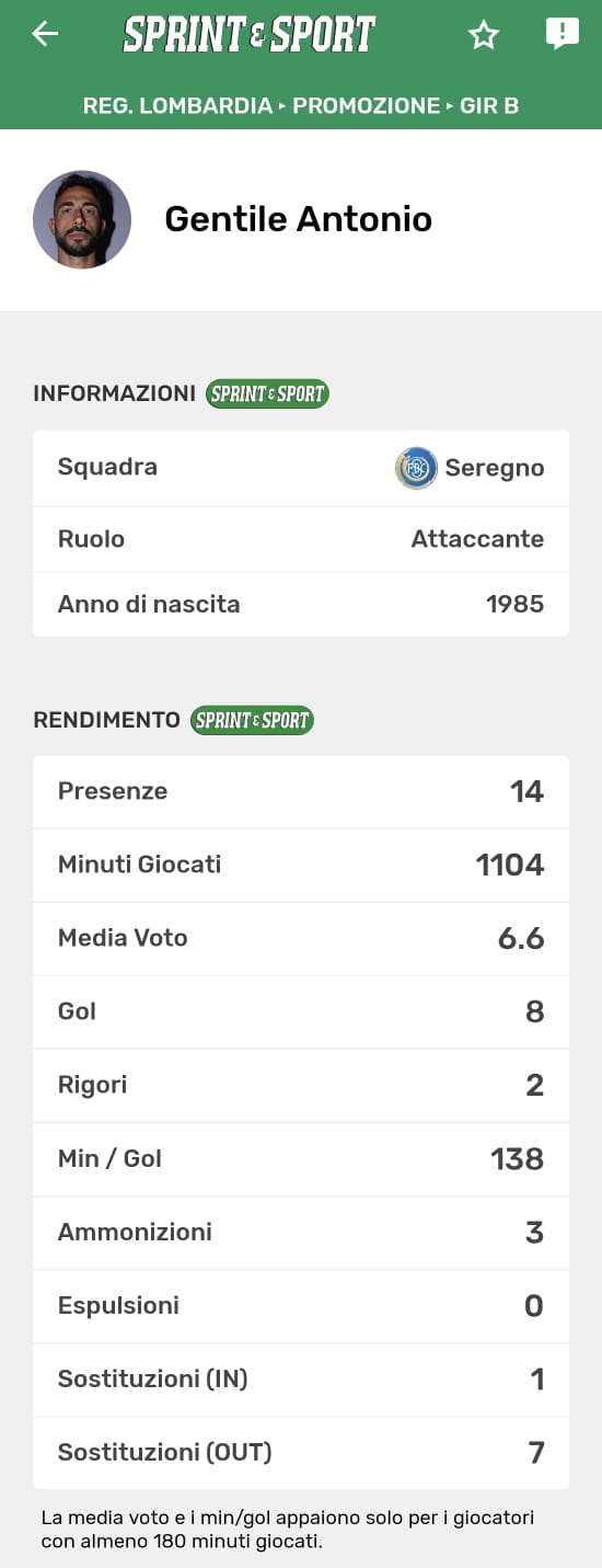 Le statistiche complete di Gentile, disponisibili solo sull'app di Sprint e Sport: clicca l'immagine per scaricarla!