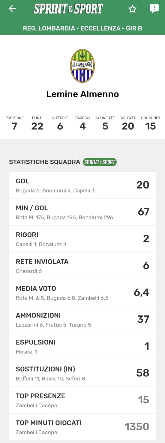 Le statistiche di squadra del Lemine Almenno, disponibili solo sull'app di Sprint e Sport: clicca l'immagine per scaricarla!