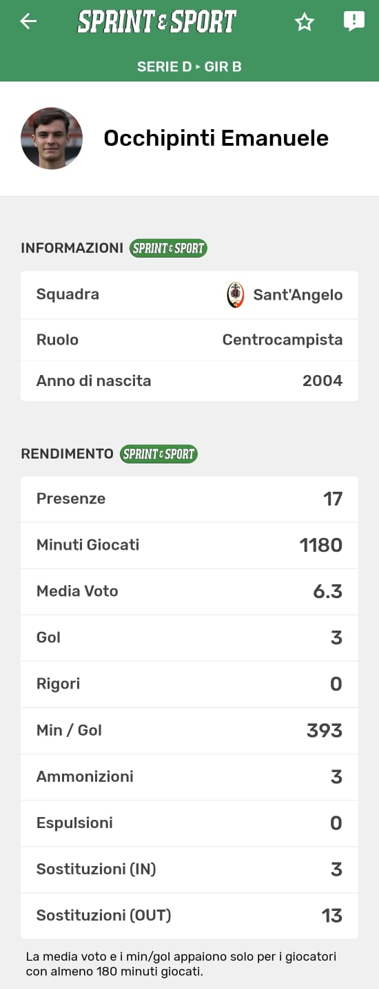 Le statistiche complete di Occhipinti, disponisibili solo sull'app di Sprint e Sport: clicca l'immagine per scaricarla!
