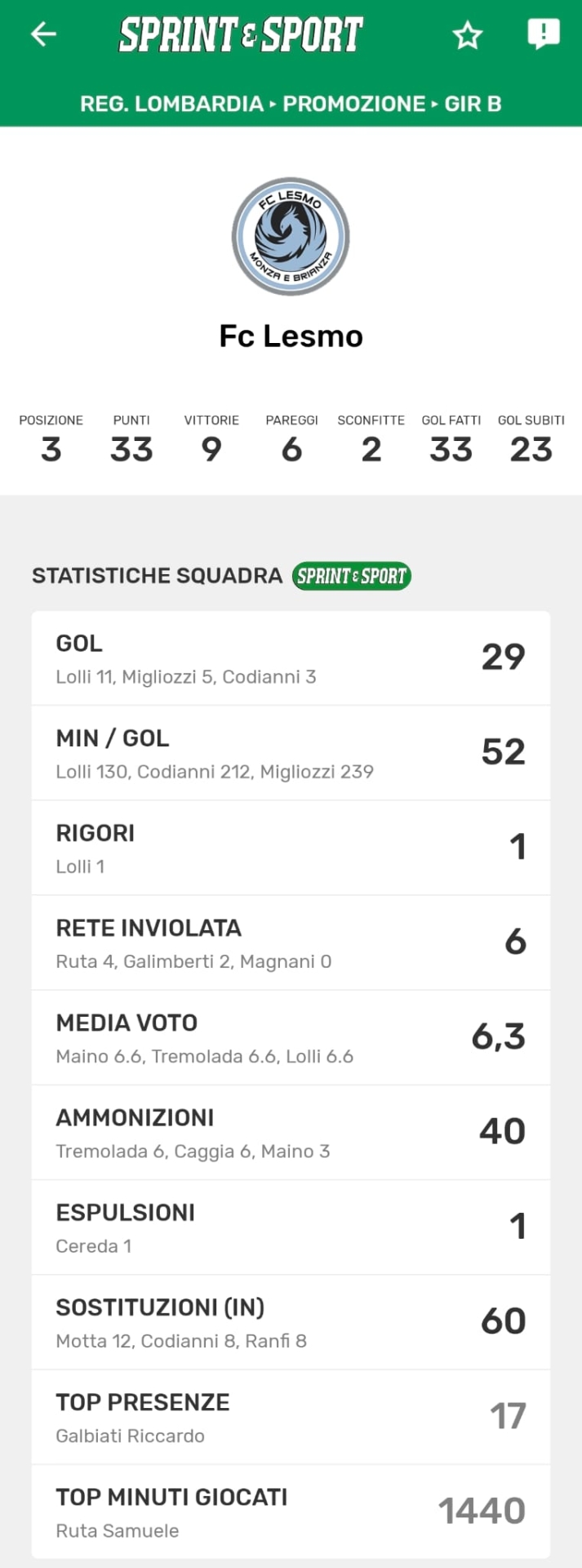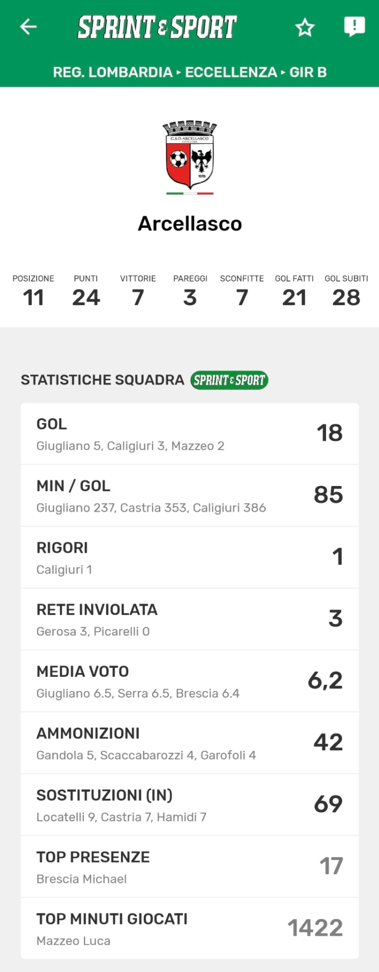 Le statistiche complete dell'Arcellasco, disponibili SOLO sull'app di Sprint e Sport: clicca l'immagine per scaricarla!