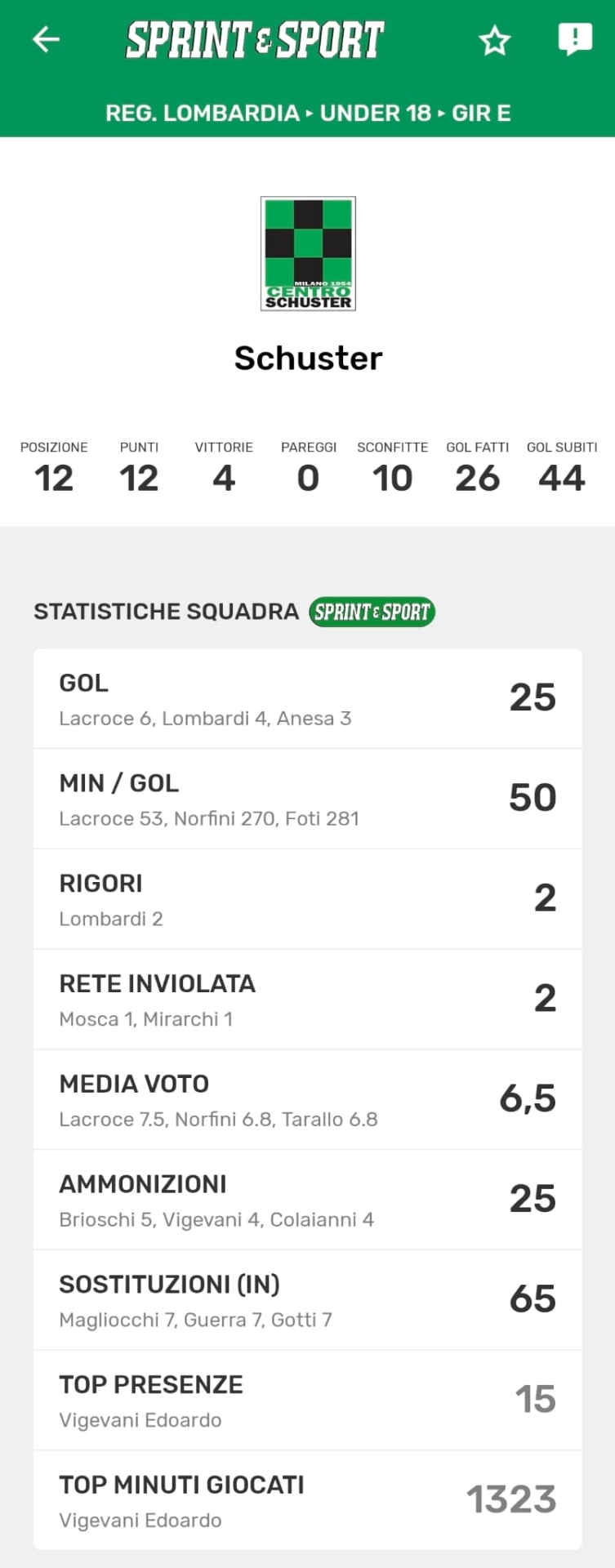 Lo Schuster sta attraversando una stagione complessa, chiudendo il girone d’andata con soli 12 punti e una posizione che lo vede quintultimo in classifica. L’inizio è stato un vero e proprio shock, con una pesante sconfitta per 8-1 contro l'FC Milanese e una serie di 3 sconfitte consecutive che hanno messo a dura prova la squadra. Tuttavia, la squadra ha reagito a novembre con una vittoria fondamentale contro il Montanaso, che rimane finora l’highlight della stagione. Purtroppo, la ripresa non è stata costante: dicembre si è chiuso con due sconfitte di fila, e la difesa continua a essere un punto debole, con ben 44 gol subiti, un dato che rispecchia la fragilità del reparto difensivo. La squadra deve ancora recuperare il match contro il Tribiano, il che potrebbe rivelarsi un’opportunità importante per dare una scossa al campionato. Per il girone di ritorno, lo Schuster dovrà urgentemente lavorare sulla solidità difensiva e cercare di ritrovare la continuità che ha mostrato solo in rari momenti. La stagione è ancora lunga, ma servirà una reazione decisa per togliersi qualche soddisfazione.