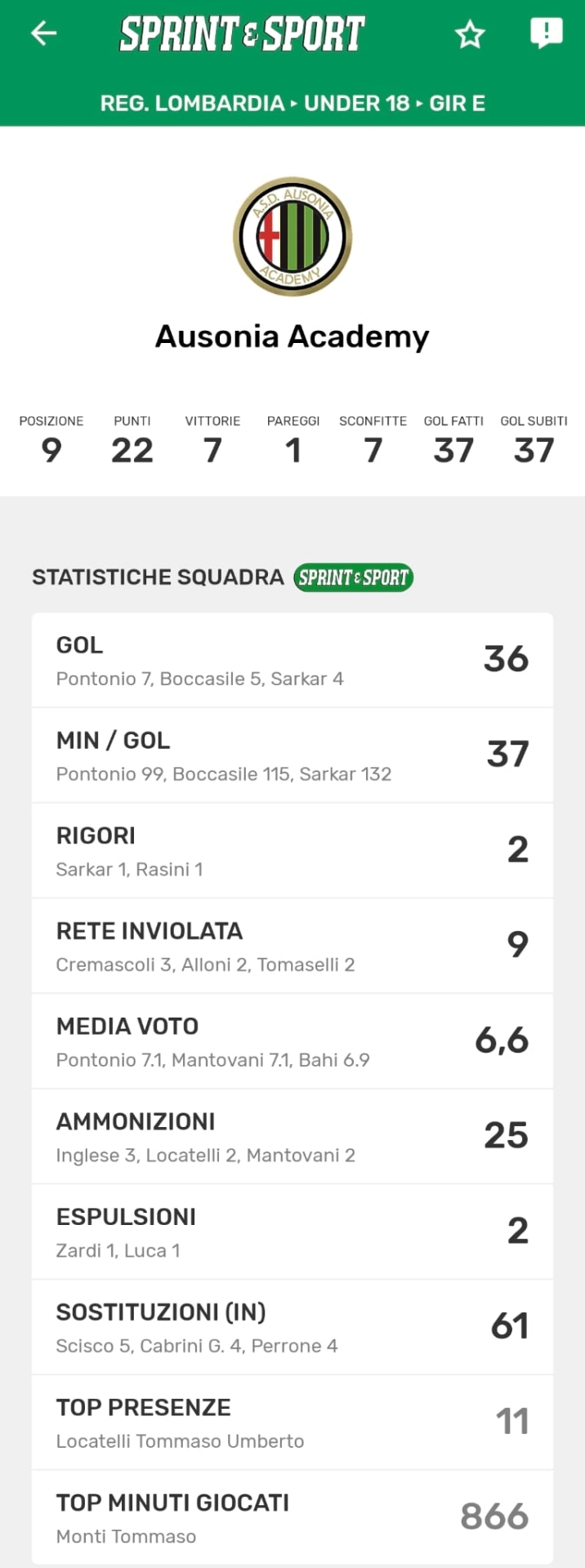 Un girone d'andata all'insegna dell'equilibrio per l’Ausonia Academy, che chiude al nono posto con numeri quasi perfetti nella loro simmetria: 7 vittorie, 7 sconfitte, 37 gol fatti e altrettanti subiti. La squadra ha mostrato lampi di grande solidità, come nel mese di ottobre, chiuso con un brillante filotto di quattro vittorie consecutive. Non mancano però le ombre, con alcune pesanti sconfitte che hanno rischiato di comprometterne il morale, come quelle arrivate contro Real Milano e Tribiano. Molto importante, in termini di fiducia, la sofferta vittoria arrivata nell’ultima gara del girone contro lo Schuster, che consente di guardare con ottimismo alla seconda parte di stagione. Per crescere ulteriormente, sarà fondamentale trovare maggiore continuità e correggere alcune lacune difensive che hanno pesato sul bilancio complessivo. Le potenzialità ci sono, ma serve un cambio di marcia per puntare più in alto.