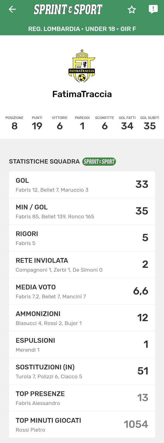 Il percorso del FatimaTraccia ricalca sotto molti aspetti quello del Basso Pavese, con cui condivide la posizione in classifica a quota 19 punti. Anche qui si trova una squadra dalle due facce: incisiva in attacco, con 34 reti segnate, ma troppo fragile in difesa, con 35 gol subiti. L’avvio di stagione è stato altalenante, caratterizzato da pesanti sconfitte contro formazioni di vertice come Pavia e Rozzano, ma anche da vittorie di grande prestigio, come quelle ottenute contro il Basso Pavese e l’Opera. Questo andamento imprevedibile rende il FatimaTraccia una delle squadre più enigmatiche del campionato, capace di tutto e del suo contrario. La squadra può però contare su una certezza assoluta: Fabris, capocannoniere del girone con 12 reti, è il vero trascinatore e rappresenta il punto di forza di un attacco prolifico. Per il girone di ritorno, il FatimaTraccia dovrà lavorare per trovare maggiore equilibrio in fase difensiva e, se ci riuscirà, potrà migliorare ulteriormente la sua posizione in classifica.