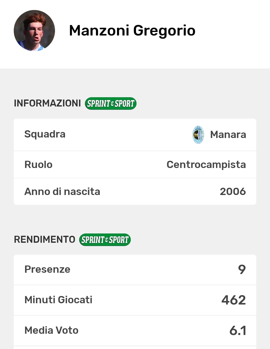 La scheda stagionale di Gregorio Manzoni: sulla nostra App tutte le statistiche individuali e di squadra dell'Eccellenza