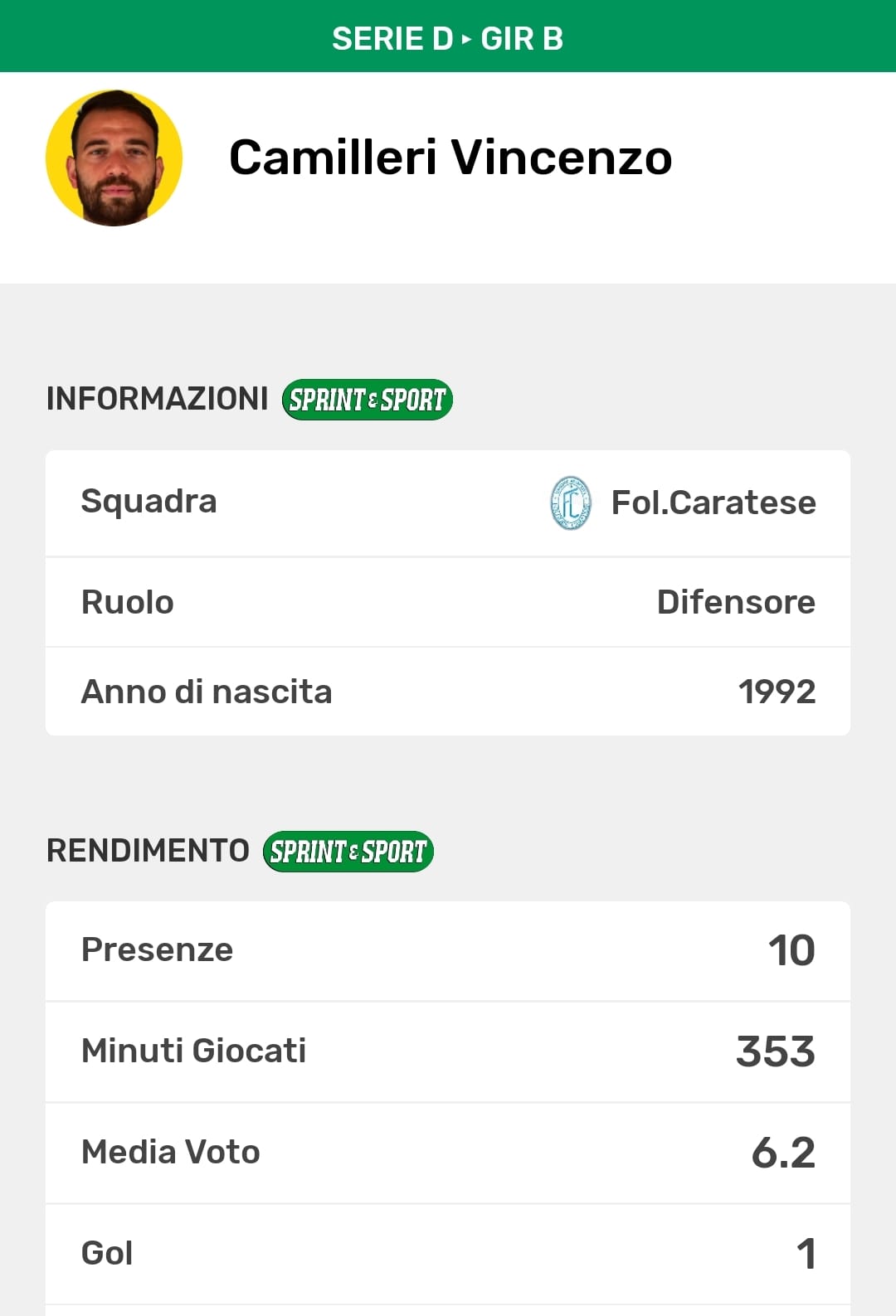 La scheda stagionale di Vincenzo Camilleri: sulla nostra App tutte le statistiche della Serie D