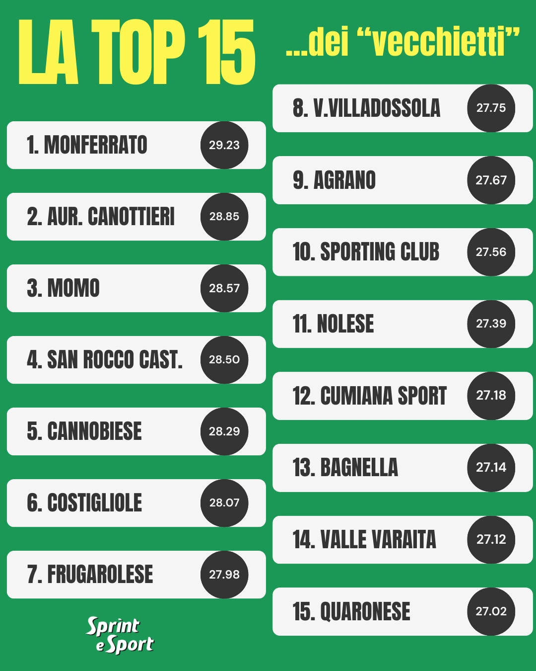 Le prime 15 squadre più longeve della Prima Categoria piemontese sono le uniche con un’età media superiore ai 27 anni, a conferma che le restanti 97 società puntano su molti giocatori nati dal 1998 in poi. Al vertice della classifica troviamo il Monferrato, squadra del Girone G, che vanta un’età media superiore ai 29 anni. Nonostante l’impiego regolare del talentuoso classe 2006 Nicolò Agosta, la formazione guidata da Carmelo Schiavone "paga" statisticamente l’esperienza dei suoi interpreti, ma soprattutto ne giova in termini di classifica visto il bellissimo e in parte sorprendente terzo posto al giro di boa. In seconda posizione un’altra squadra del Girone G, l'Aurora Canottieri Pizzerie, che però al penultimo posto vive una situazione decisamente agli antipodi rispetto ai gialloblù prima citati. La formazione allenata da Luca Giannini ha per altro stabilito un record di longevità all’undicesima giornata, raggiungendo un’età media di 30,6 anni; un risultato possibile nonostante la presenza in campo del classe 2007 Claudio Daci, che ha bilanciato una rosa con ben quattro giocatori nati negli anni '80. Per il terzo gradino del podio invece ci spostiamo nel Girone A, dove il Momo di Claudio Miserotti ha visto un graduale aumento dell’età media a partire dalla settima giornata. Un incremento che si è tradotto in un miglioramento delle prestazioni e dei risultati, confermando il valore dell’esperienza nella rosa. Sopra i 28 anni anche il San Rocco Castagnaretta (Girone F), che dopo i Playoff della scorsa stagione sta faticando in questo campionato, la Cannobiese (Girone A), che sta realizzando un vero exploit centrando attualmente i Playoff, e il Costigliole (Girone G), squadra costruita per un posto nei Playoff che però occupa una posizione in zona Playout.