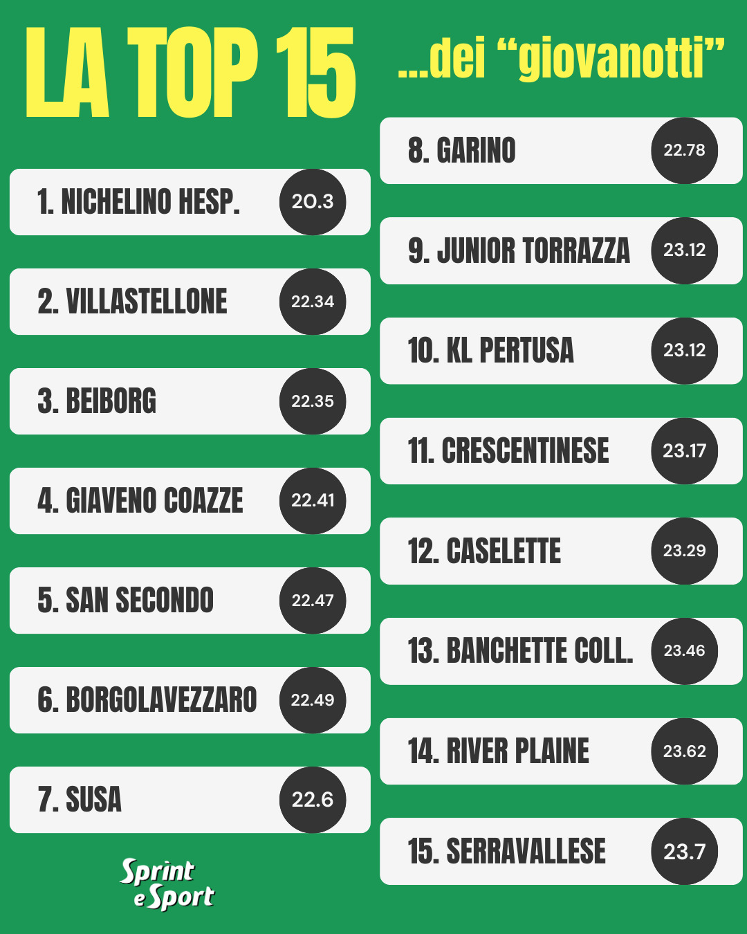 Per gli appassionati e i conoscitori della categoria non è una sorpresa: il Nichelino Hesperia è di gran lunga la squadra più giovane della Prima Categoria. La "gold generation" guidata da Giovanni Scopacasa ha infranto ogni record relativo all’età con i suoi 20,3 di media, distanziando la seconda classificata di ben due anni. La rosa è composta in gran parte da giocatori nati dopo il 2000 e il primato societario è stato raggiunto alla sesta giornata, con un’età media di soli 19,7 anni. In diverse occasioni, la squadra ha schierato in distinta esclusivamente calciatori nati dopo il 2001. Questo primato è stato messo comunque a dura prova da un’altra compagine del Girone E, il Villastellone secondo con 22,34 anni. Retrocessa dalla Promozione, la squadra ha deciso di puntare tutto sui giovani, registrando l’età media più bassa nell’ultima giornata, pari a 21,6 anni: al momento, però, la classifica dice tredicesimo posto e zona Playout. Il terzo gradino del podio ci porta nel Girone D, dove il Beiborg si distingue come la squadra più giovane del gruppo torinese. Un risultato significativo per la neopromossa, che è riuscita a mantenere una media di 22,35 anni, contendendo il primato al Giaveno Coazze fino all’ultima giornata. Anche in questo caso, eppure, si parla di piena zona Playout per entrambe, come d'altronde anche per le seguenti Borgolavezzaro e San Secondo.