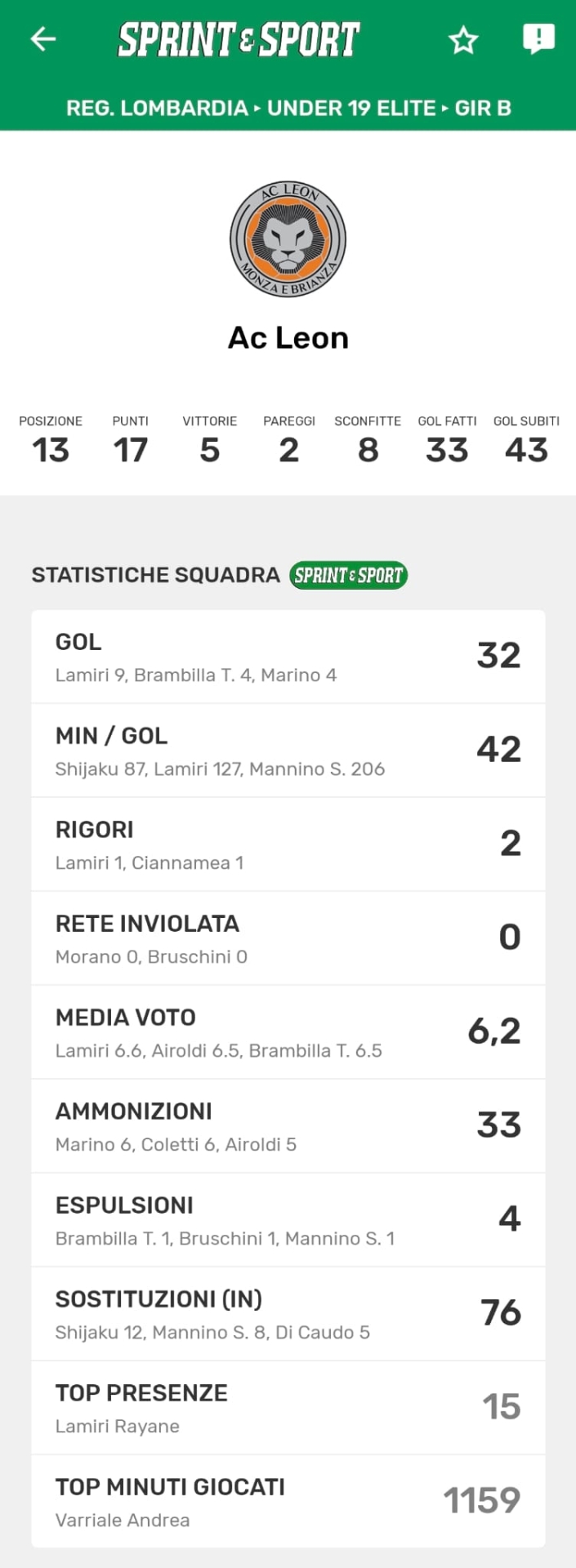 Negli anni, in realtà, di risultati clamorosi in categoria non ne sono arrivati, se non due semifinali di Coppa Lombardia perse con Rozzano e Club Milano, ma quando ti chiami AC Leon è normale aspettarsi qualcosa di più di un quart'ultimo posto in classifica. I vimercatesi, invece, chiudono l'anno con tanti punti interrogativi lasciati per strada, in particolare una fase difensiva che, al pari del Bresso, è la peggiore del campionato. I 43 gol subiti e i 33 fatti, ovvero il terzo miglior attacco, spiegano il paradosso della squadra di Davide Draisci, subentrato a Gianluca Balestri dopo la quinta giornata. La Leon è stata infatti capace di rompere l'imbattibilità della Lentatese e recuperare due volte la Vis Nova, ma anche di crollare con Speranza Agrate (4-1), CG Bresso (5-2), Real Milano (3-4), Villa (4-1) e Ardisci (1-4), simbolo forse di una squadra a cui è mancata un po' di sicurezza nei propri mezzi, oltre che qualche sbavatura di troppo là dietro. Nulla, comunque, è ancora perduto, anzi, la salvezza dista appena un punto.