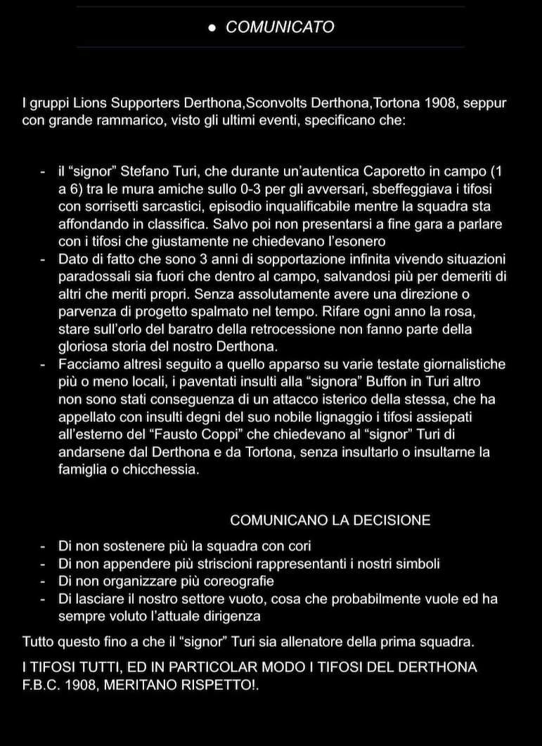 Situazione e contesto nel quale i tifosi hanno così deciso la forma della loro protesta che si realizzerà come descritto nel comunicato, scegliendo ‘di non sostenere più la squadra con cori, di non appendere più striscioni rappresentanti i nostri simboli, di non organizzare più coreografie e i lasciare il nostro settore vuoto, cosa che probabilmente vuole ed ha sempre voluto l'attuale dirigenza. Tutto questo fino a che il "signor" Turi sia allenatore della prima squadra. I TIFOSI TUTTI, ED IN PARTICOLAR MODO I TIFOSI DEL DERTHONA F.B.C. 1908, MERITANO RISPETTO!’.