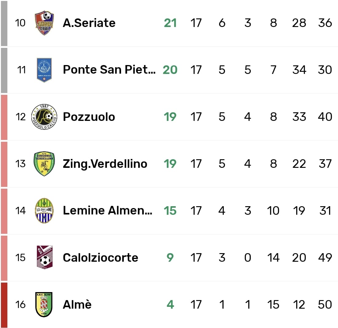 Il pareggio fa infatti più contenti i bianconeri, al terzo risultato utile consecutivo e in continua risalita dall'arrivo in panchina di Andrea Sottocorno, tecnico della prima squadra. Il Pozzuolo aggancia così lo Zingonia Verdellino al bordo dei playout e si porta a -1 dalla salvezza diretta, anche grazie a un assist dalle retrovie. Alle spalle dei ragazzi della Martesana, infatti, chiude la 17esima giornata il ritorno in grande stile del Lemine Almenno, per gol fatti, significato e qualità del successo sul Ponte San Pietro. Il risultato finale recita 4-1 per i gialloverdi, che in un colpo solo interrompono una striscia di 6 sconfitte consecutive e vincono uno scontro diretto importantissimo per la salvezza, portandosi a -5 dall'obiettivo e allungando a +6 sul Calolziocorte penutlimo.