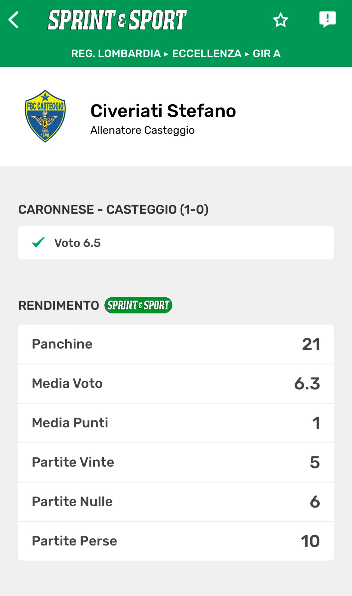 Con un comunicato ufficiale attraverso i propri canali social, il Casteggio ha annunciato così la separazione dall'allenatore della prima squadra Stefano Civeriati: «FCB Casteggio 1898 comunica che Stefano Civeriati non ricoprirà più il ruolo di allenatore della prima squadra. A Stefano vanno i ringraziamenti del Club per il lavoro svolto in questi mesi con impegno, passione e dedizione, augurando le migliori fortune per il prosieguo della carriera professionale». Arrivato nel maggio del 2024, l'esperienza di Civeriati sulla panchina di una delle società più antiche del calcio lombardo si chiude dopo appena 260 giorni.