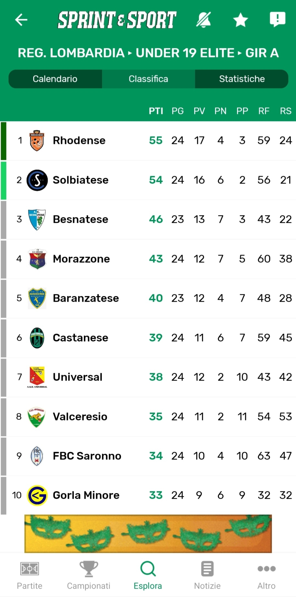 La parte alta della classifica del girone A di Under 19 élite. Clicca qui per scaricare la nostra app e consultare la classifica completa