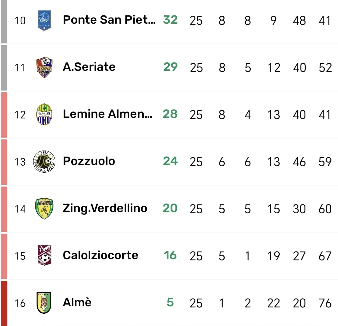 Quella salvezza che passa innanzitutto dalla sfida con un Almè all'ultimissima spiaggia. Per giocare i playout, infatti, i gialloverdi dovrebbero vincere tutte e 5 le restanti partite per agganciare lo Zingonia, che dovrebbe invece perderle tutte, a partire dal delicatissimo scontro diretto in casa del Pozzuolo. Una zona rossa in cui va in scena anche l'incrocio tra le altre due possibili sfidanti nella post season, ovvero Calolziocorte e Lemine Almenno, con la prima chiamata a vincere per iniziare ad accorciare una forbice di punti da dimezzare per disputare il playout.