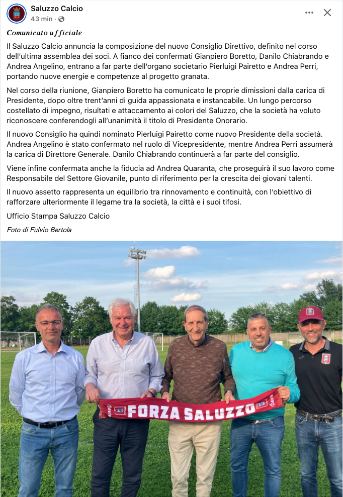 Nel corso della riunione, Gianpiero Boretto ha comunicato le proprie dimissioni dalla carica di Presidente, dopo oltre trent’anni di guida appassionata e instancabile. Un lungo percorso costellato di impegno, risultati e attaccamento ai colori del Saluzzo, che la società ha voluto riconoscere conferendogli all’unanimità il titolo di Presidente Onorario.