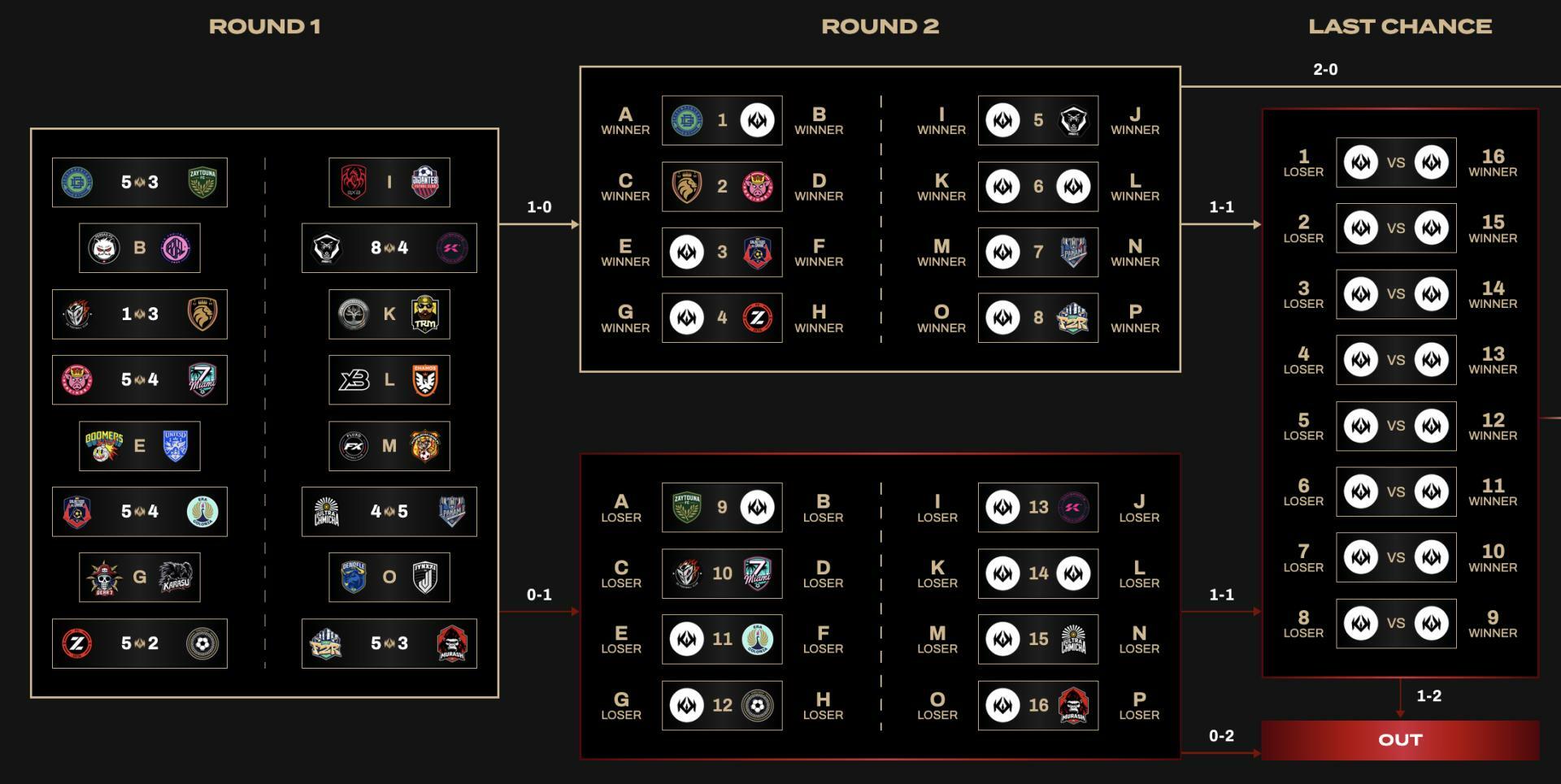 Finito un primo giorno denso di impegni, dire che il tabellone stia prendendo forma sarebbe forse eccessivo, anche se due partite del Round 2 sono già ufficiali. Nel Loser Bracket, dove si sfidano le perdenti del primo turno, con l'obbligo di vincere per evitare l'eliminazione e accedere al Last Chance, sarà dentro o fuori tra Germania e USA con G2-Miami 7. Nel Winner Bracket, dove giocano le vincenti del primo turno (chi vince ancora accede agli ottavi, chi perde finisce al Last Chance), sarà invece partidazo tutto spagnolo tra Ultimate Móstoles e Porcinos.