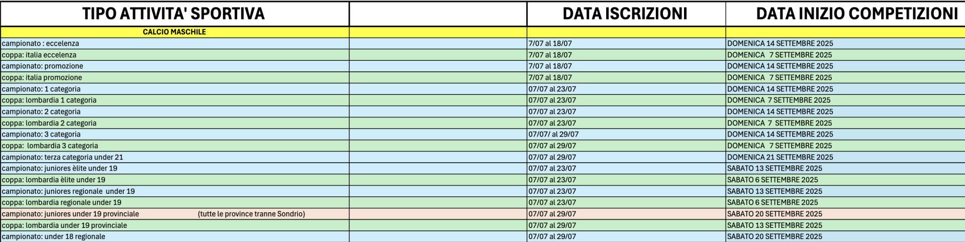 Uniche eccezioni, il campionato di Terza Categoria Under 21, in programma domenica 21 settembre, e quello di Under 18, che partirà sabato 20 settembre. Di seguito l'elenco completo, compreso di date per l'iscrizione alle varie categorie: